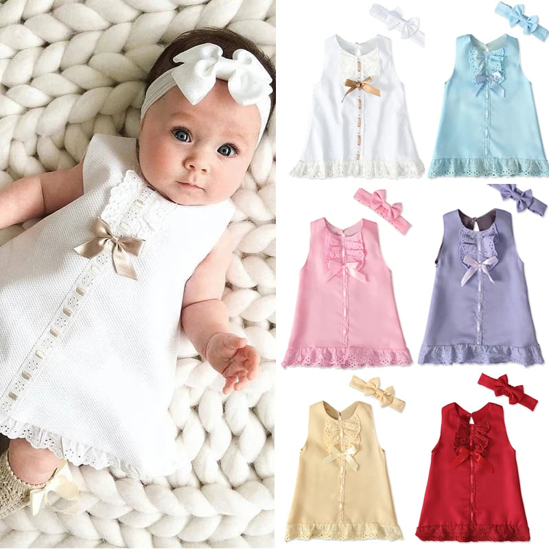 Newborn Baby Girls Dresses Summer Cute Bow Sleeveless Princess Party Birthday Lace Dress+Headband 2Pcs Kids Toddler Clothes A405