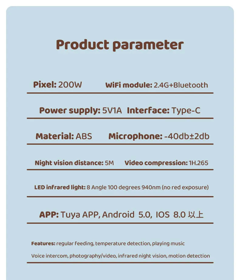 Feature: Multiple Receiver,Intercom,IP Network,Mobile Phone APP,Baby Cry Alarm,Motion Detection,Feeding Time Reminder,Temperature Monitoring,Humidity Monitoring,Nightlight,Power Saver,Portable,Music